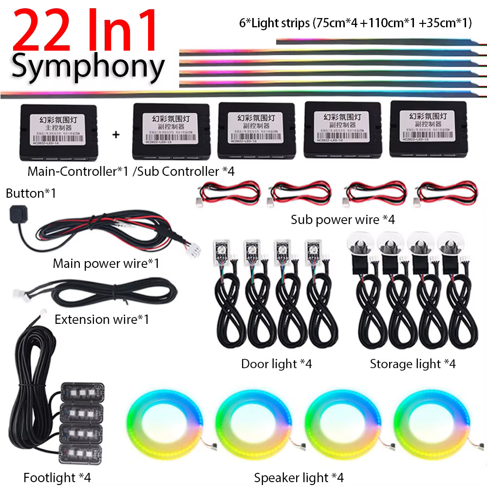 Kit Lumini Ambientale Auto RGB 22 in 1 Symphony Rainbow LED, control prin aplicatie, efecte muzicale